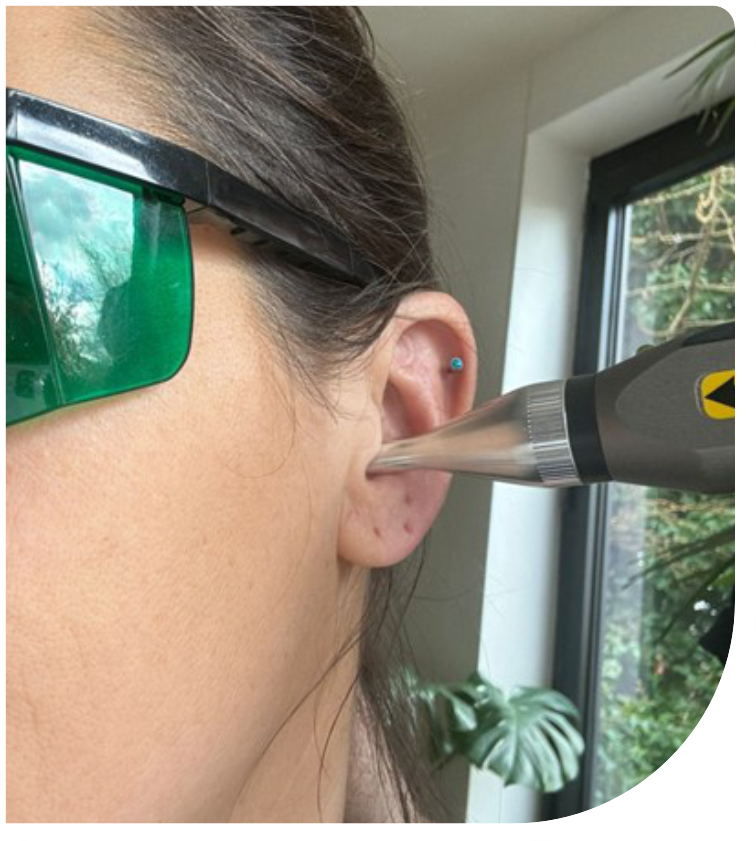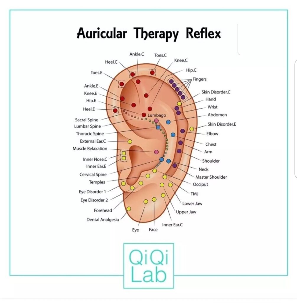 Low Level Laser Therapy (LLLT) includes infrared lasers and red light therapy. Red light therapy works on the surface of the skin, and infrared light penetrates deeper into the tissue. QiQiLab combines the ear mapping of Auricular Therapy with an LLLT probe, placed on certain points in the ear, to stimulate detox pathways and to trigger endorphins.